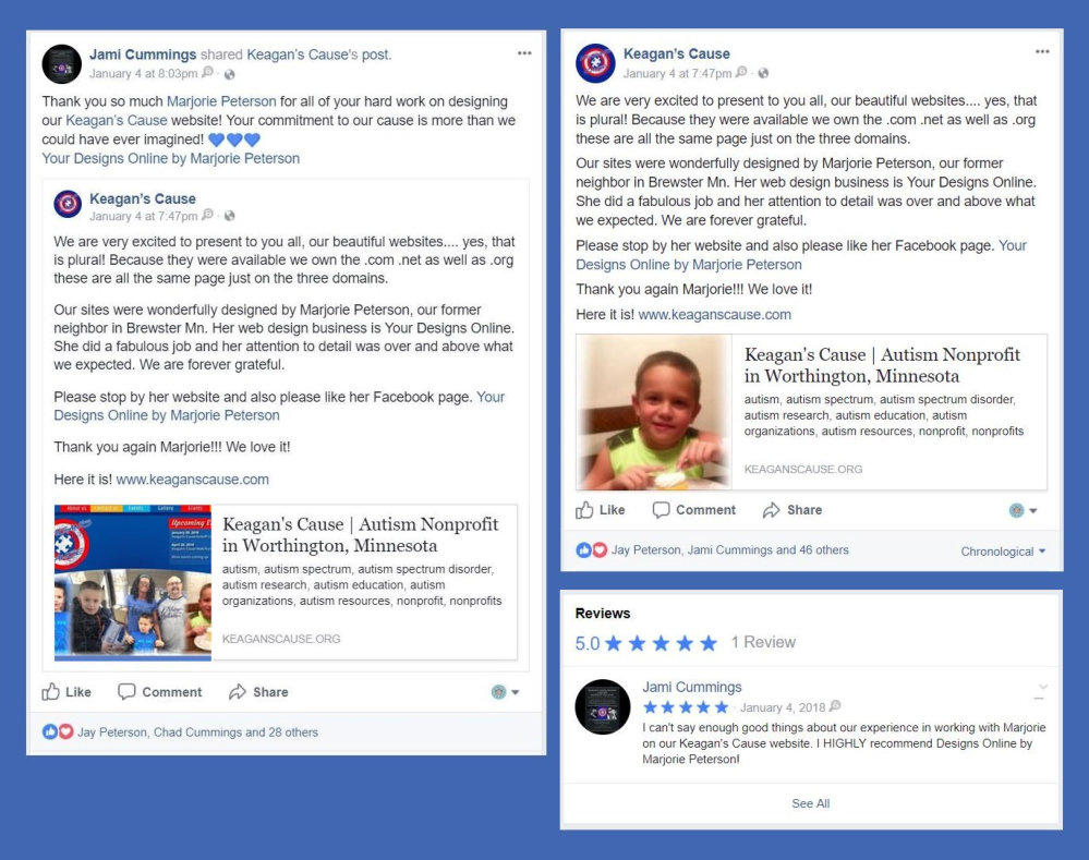 "The website looks great! The board thought you did an awesome job as well when we showed them last night. We will put it out on Facebook for everybody to see! Honestly we can't thank you enough for all of the time you have been spending on this!! Thank you again for all your hard work!!!”Chad & Jami CummingsKeagan’s Cause in Worthington, MN